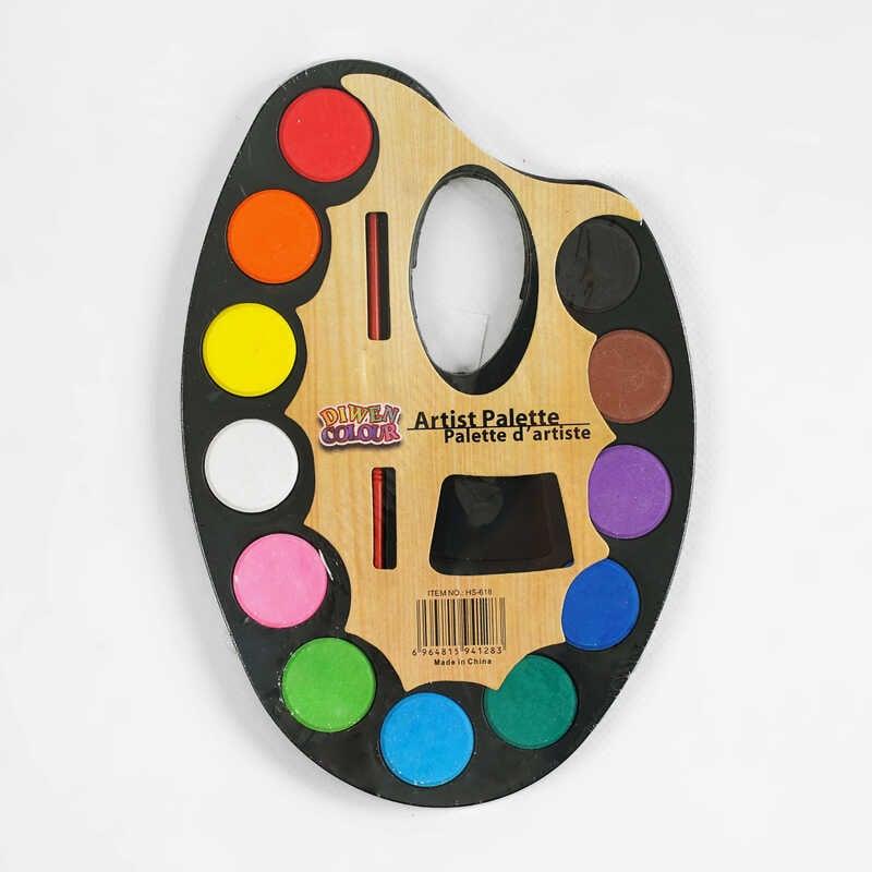 Тип – акварель. Палітра – 12 кольорів. Упакування – плівка. У коробці – 12 фарб. До набору додається пензлик.