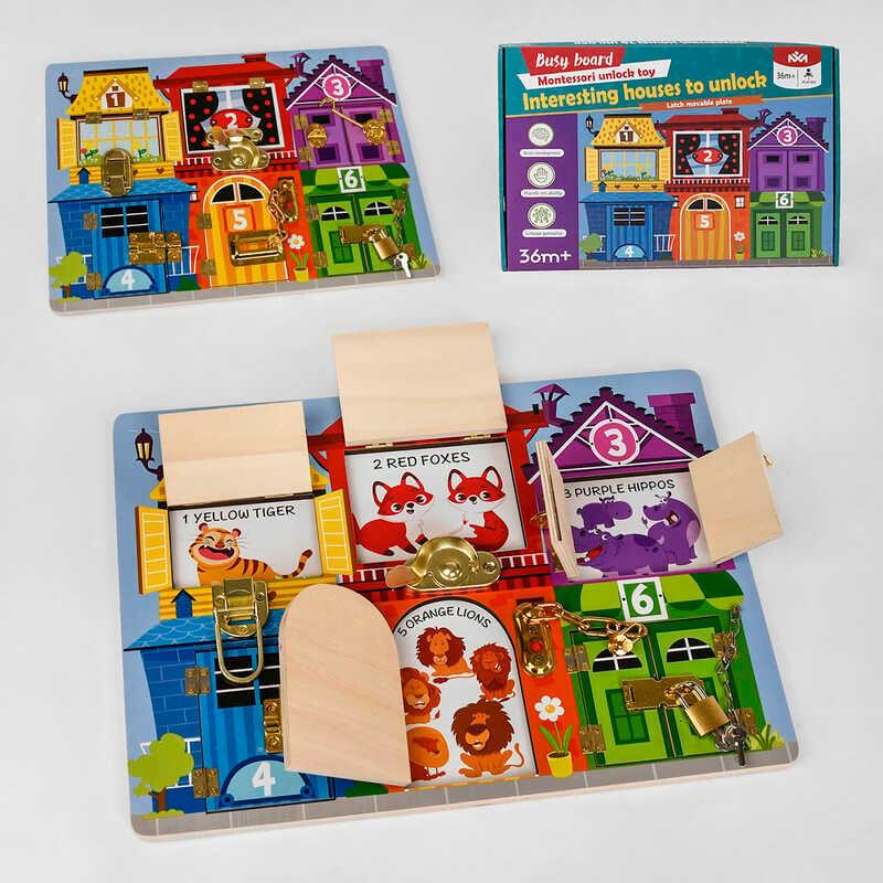 Бізіборд дерев`яний С 49417 “Квартирки з тваринами”, 6 видів замочків, що відкриваються віконця,…