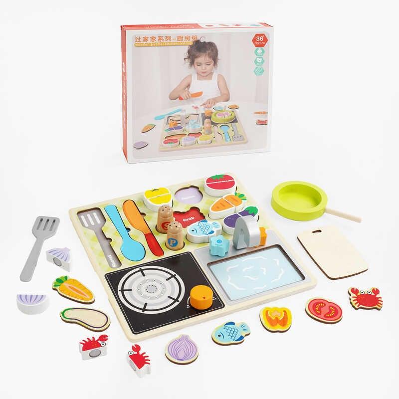 Чудовий дерев’яний сортер для допитливих малюків, який імітує справжню кухню! Тут ви знайдете раковину, варильну поверхню, посуд, кухонне приладдя і цілий набір продуктів. Частина фігурок продуктів складається з двох частин, які кріпляться на м’яких липучках. Іграшковий ніж допоможе нарізати їжу, та навчить малечу безпечному користуванню кухонним приладдям.