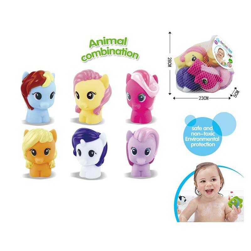 Зробіть процес купання дитини веселим за допомогою гумових іграшок! Кольорові поні з милими оченятами з радістю складуть компанію малюку і подарують безліч позитивних емоцій. Набір складається з 6 поні різного кольору. Кожна іграшка має пискавку.