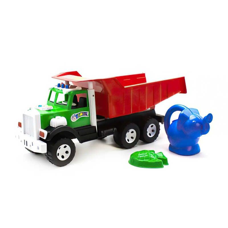 Пластикова машинка-самоскид з відкидним кузовом для гри на вулиці та вдома. Лійка «Слонік» та пасочка в комплекті. Розмір набору 52*20*21,5 см. Вага 900 г.