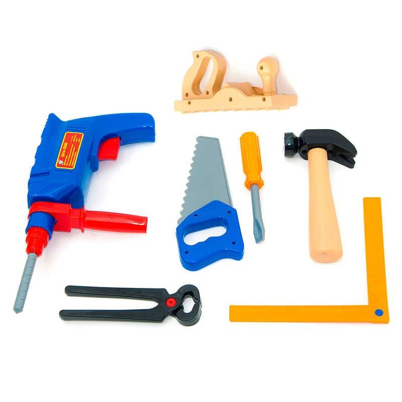 – ігровий набір складається з тесака, дриля, пили, викрутки, молотка, пасатижів і лінійки.