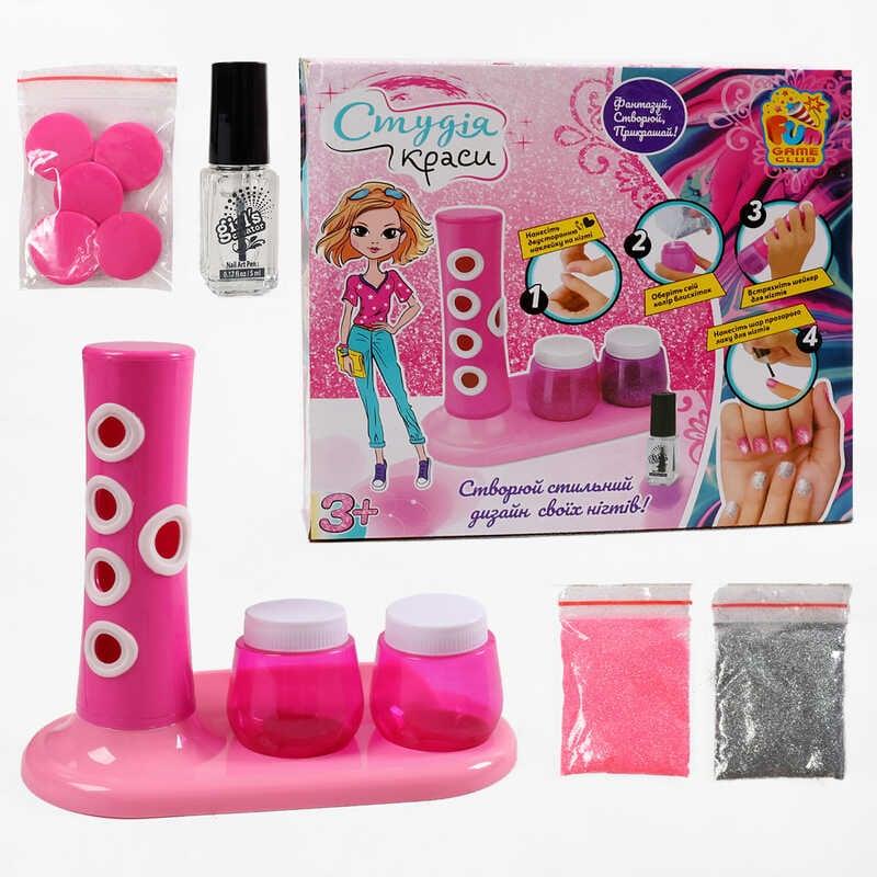 Набор Студия красоты 37691 станет идеальным подарком для Вашей юной модницы!Возьмите из набора двухсторонние наклейки и наклейте на ногти. Затем выберите понравившейся цвет блесточек, засыпьте в контейнер шейкера. Поместите пальцы в специальное отверстие шейкера и хорошо встряхните его. После этого покройте ногти прозрачным лаком и ослепительный маникюр готов!В набор входит:- Подставка;- Шейкер для ногтей;- Крышечки для закрывания отверстий в шейкере; – Контейнер для блесток;- Прозрачный лак для ногтей;- 2 вида блесток;- Набор двухсторонних наклеек для ногтей;