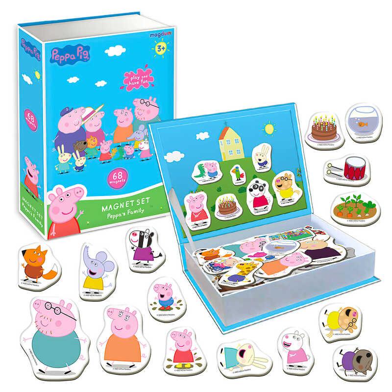 Улюблена героїня дитячого мультфільму запрошує дитину цікаво провести один день разом зі своєю родиною! Святкуйте день народження, доглядайте за улюбленцями, грайте та просто весело проводьте час – свинка Пеппа буде рада розділити з дитиною свої емоції. Набір включає 15 кольорових магнітів, які можна прикріпити на будь-яку поверхню.