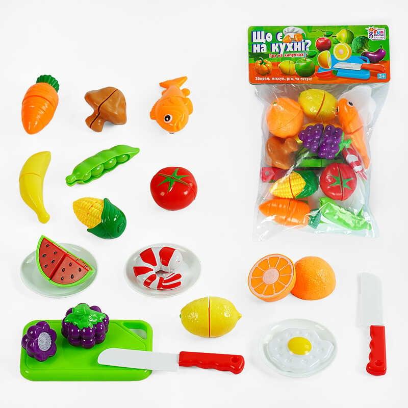 Маленькі фігурки складаються з декількох частин, які скріплюються між собою за допомогою липучок. Гра дає дитині можливість навчитися користуватися ножем, вивчити нові слова, сортувати овочі та фрукти за ознаками або кольорами, ознайомитися з особливостями кожного продукту, а також їхніми корисними властивостями.