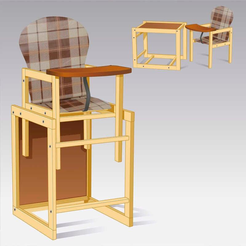 Дитячий дерев’яний стільчик для годування великий. Виріб виконаний з дерева. Стільниця ламінована, світла, широка. Спинка велика. Трансформується в маленький стіл-стільчик.
