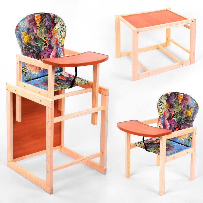 Дитячий стілець для годування великий. Виріб виконаний із дерева. Стільниця ламінована, світла, широка. Спинка велика. Трансформується у маленький стіл зі стільцем.