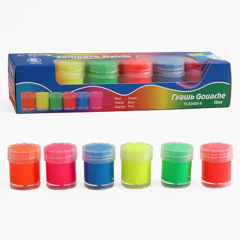 Тип – гуаш. Палітра – 6 кольорів. Упакування – коробка. Неонові яскраві фарби. У коробці – 6 фарб.