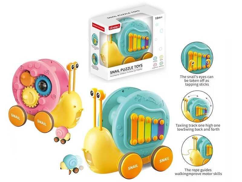Переносна домівка равлика має мелодійний ксилофон, для якого паличками стануть оченята тваринки, адже вони легко виймаються. А з іншого боку мушлі можна побачити пальчикові ігри з брязкальцями.