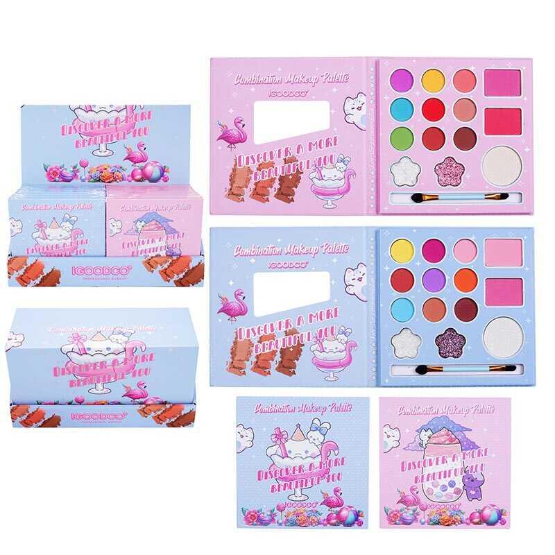 Косметика IG 3143 ЦІНА ЗА 24 ШТУКИ В БЛОЦІ, тіні, рум`яна, хайлайтер, аплікатор, в коробці