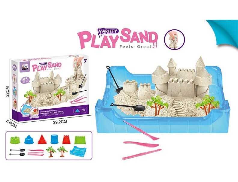 До набору включено пісочницю, що гарантує не тільки відсутність безладу під час гри, а й зручність зберігання набору. До набору включено інструменти для гри з піском, а також набір яскравих форм для нього.
