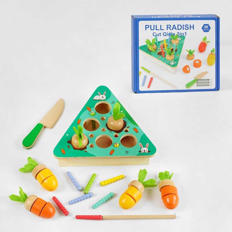 “Витягни редьку” – це весела інтерактивна гра, яка подарує безліч потішних та цікавих моментів. Гра представлена у вигляді трикутної дерев’яної платформи, куди може вставлятися редька, а поруч мешкають пронирливі гусениці. Гра чудово сприяє розвитку уяви, логічного та творчого мислення та поліпшує дрібну моторику малюка.