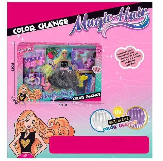 У Рапунцель було найдовше волосся, але воно не змінювало колір. А у твоєї нової ляльки – волосся не просто довге, а по-справжньому дивовижне! До набору входять лялька, 3 кольорові знімні прядки, додатковий одяг, чоботи, сумочка, щітка для волосся та муляжі засобів та інструментів для догляду за волоссям. Під дією ультрафіолету при температурі від 31°С пасма ляльки змінюють колір. Додаткові кольорові прядки дозволяють робити ляльці різні зачіски. Завдяки шарнірному з’єднанню суглобів, ноги ляльки згинаються. Сукня декорована мереживом та бантом.