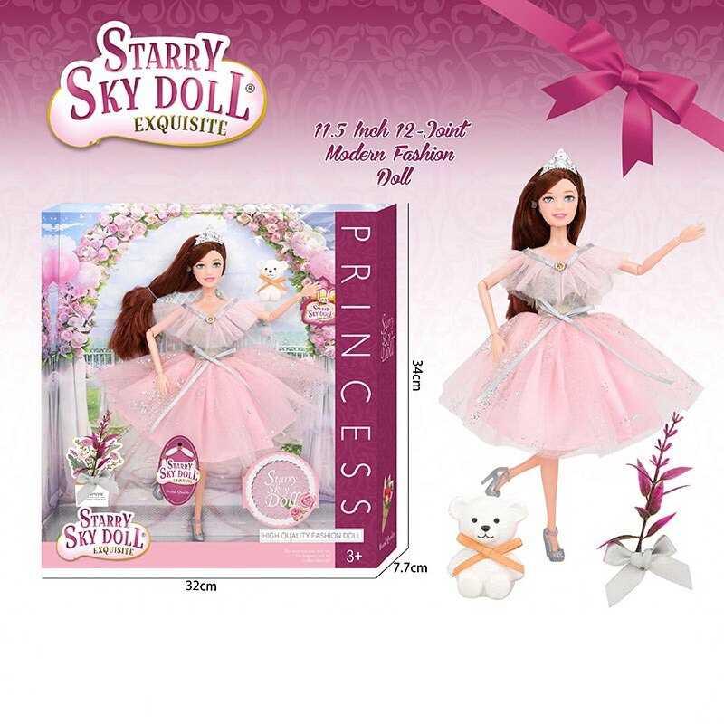 – у комплекті з лялькою йде зйомне взуття, корона, улюбленець та прикраса зі штучними квітами;