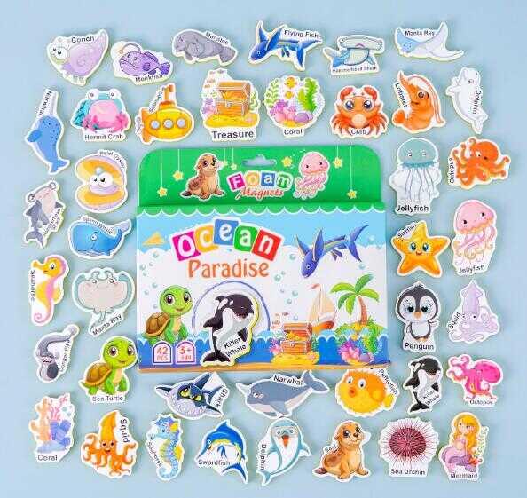 Магніти у наборі мають м’яку фомову основу, тому вони міцні та об’ємні. Кожен магнітик має не тільки яскраву ілюстрацію, але й підпис англійською мовою, тому ваша дитина розпочне своє вивчення англійської мови весело та у процесі цікавої гри.
