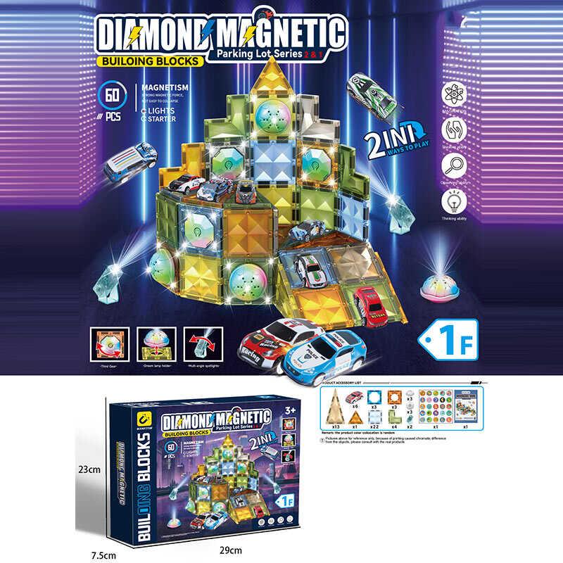Магнітний конструктор 6815 A 60 елементів, підсвічування, 6 металопластикових машинок, в коробці