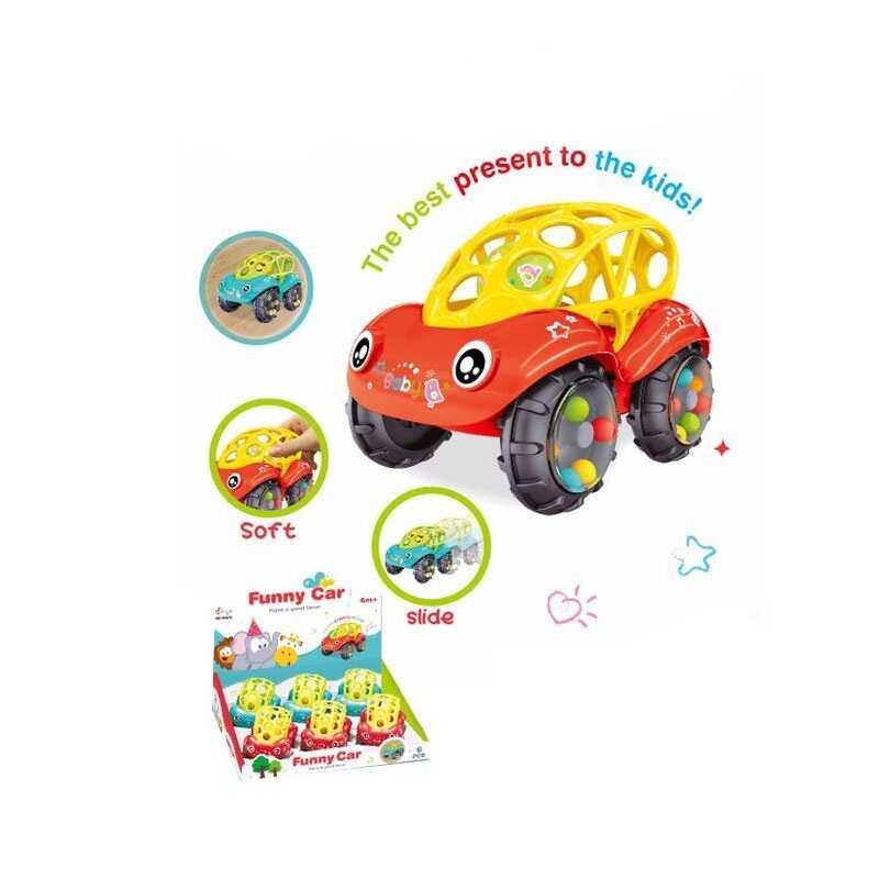 Яскрава машинка для найменших, яка здатна легко розважити дитину. Іграшка має гумовий корпус, за яким ховається велика дзвінка куля. Колеса також мають кольорові кульки, які під час руху транспорту починаються весело рухатись та видавати характерний звук. Машинка не має гострих кутів та є цілком безпечною для маленьких дітей.