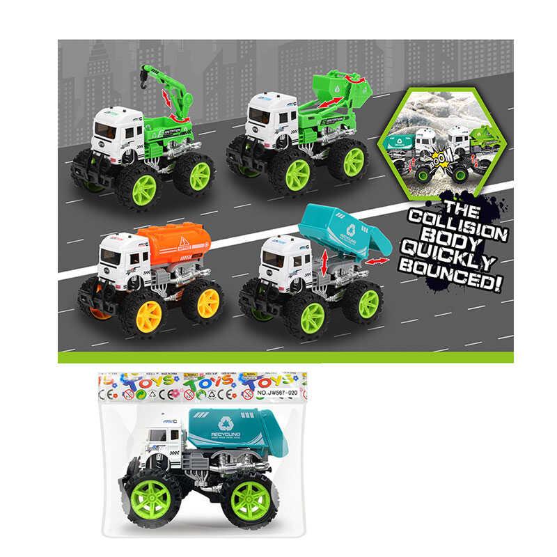 Спецтехніка у стилі мостр-трака – це оригінальна іграшка з незвичайним функціоналом. Влаштуйте всюдиходу на великих колесах випробування зіткненнями з перешкодами, і ви побачите як спритно трансформується його підвіска у момент удару.