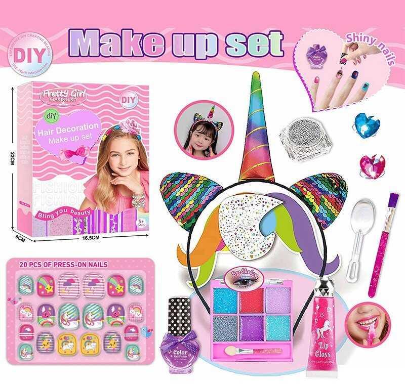Виглядати яскраво та оригінально так просто з набором косметики та прикрас! До комплекту входять лак, глітер, прикраси, блиск для губ, обруч, блискітки, аплікатор, пензлик, наліпки для нігтів. За допомогою елементів набору можна власноруч створити образ казкового героя.