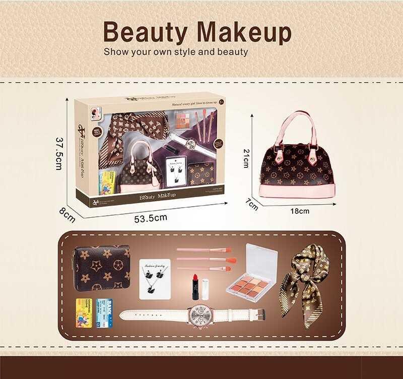 – багатий набір: у комплекті косметичні аксесуари, губна помада, тіні для повік, пензлики для макіяжу, прикраси, годинник, шарф, гаманець, а також модна сумочка;