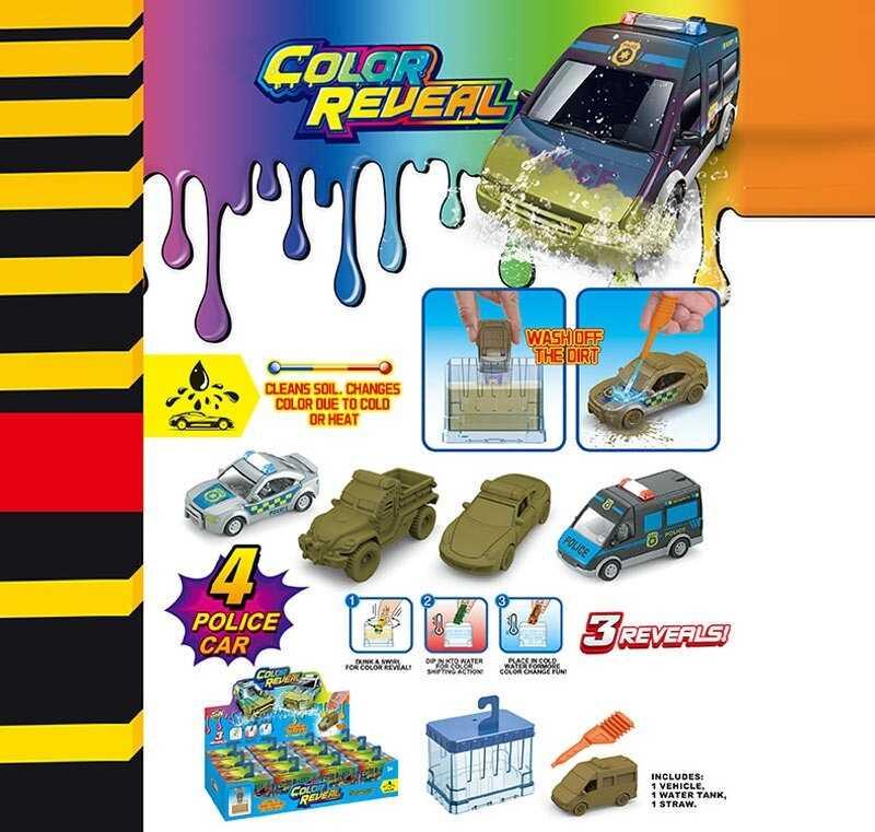 Кожну машинку у наборі вкрито імітацією бруду – бурою фарбою, яка легко змивається, відкриваючи малюкові справжній колір та дизайн машинки. Також корпус машинки змінює колір залежно від температури: помийте її теплою водичкою і її колір буде один, а помийте холодною – він кардинально зміниться!