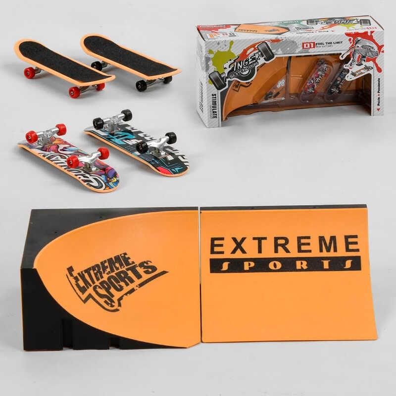 Скейт-фінгерборд ВВ 505 D захоплююча пальчикова гра для юних рейдерів, які люблять швидку їзду і складні трюки! Головна особливість гри полягає в тому, що катаєшся ти пальцями рук, розвиваючи спритність та гнучкість. Великий трамплін виконаний з щільного пластику з рифленою поверхнею для кращого зчеплення коліс самоката з поверхнею. Пофарбований трамплін в колірне сполучення оранжевого і чорного, а на рампі завдано принт з написом – “Extreme Sports”. Пальчикові скейти це зменшена копія його справжнього прототипу. На пластиковій деці зверху наклеєна спеціальна наліпка – наждак. Вона потрібна для зниження тертя, внаслідок чого пальці стійко стоять на покритті при виконанні трюків. З нижнього боку деки наклеєний прикрашає принт. Пластикові колеса надійно прикріплені до металевої підвіски болтом. У комплекті також передбачений ремкомплект в який входить – викрутка, запасні колеса і болти. Комплектація набору ВВ 505 D: – 2 частини трампліну; – 2 скейти; – викрутка; – 2 комплекти запасних коліс; – 4 болтики. Розмір скейта – 2.5х9.5х2 см. Розмір трампліну в складеному стані – 30.2х5.1х7.6 см.
