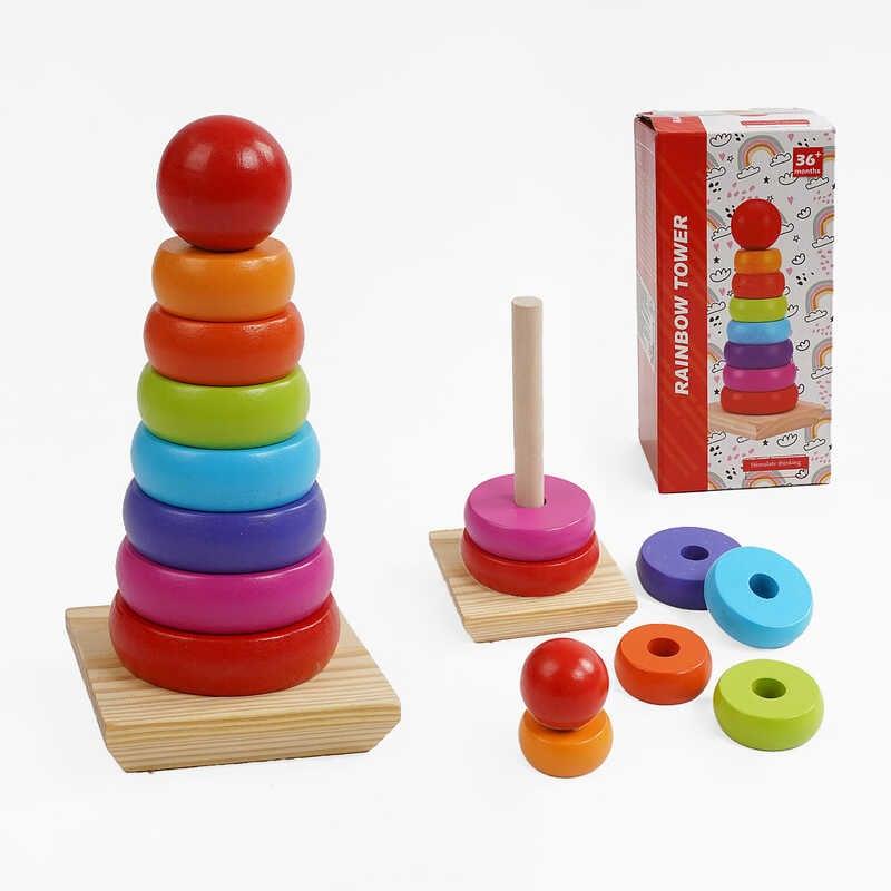 Пірамідка дерев`яна C 68838 висота 20 см, 7 кілець різного діаметру, 1 кулька, в коробці