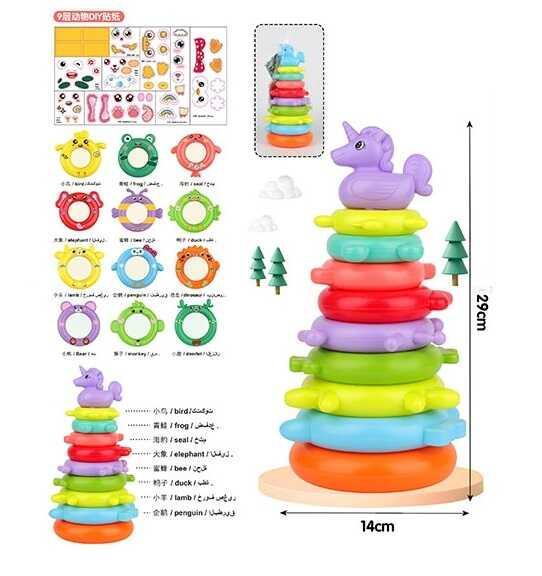 Тематична дитяча пірамідка з приємним кольоровим забарвленням. Складається з 10 елементів: 9 тематичних кілець та верхівки у вигляді єдинорога. До комплекту входять тематичні наліпки для прикрашення кілець.