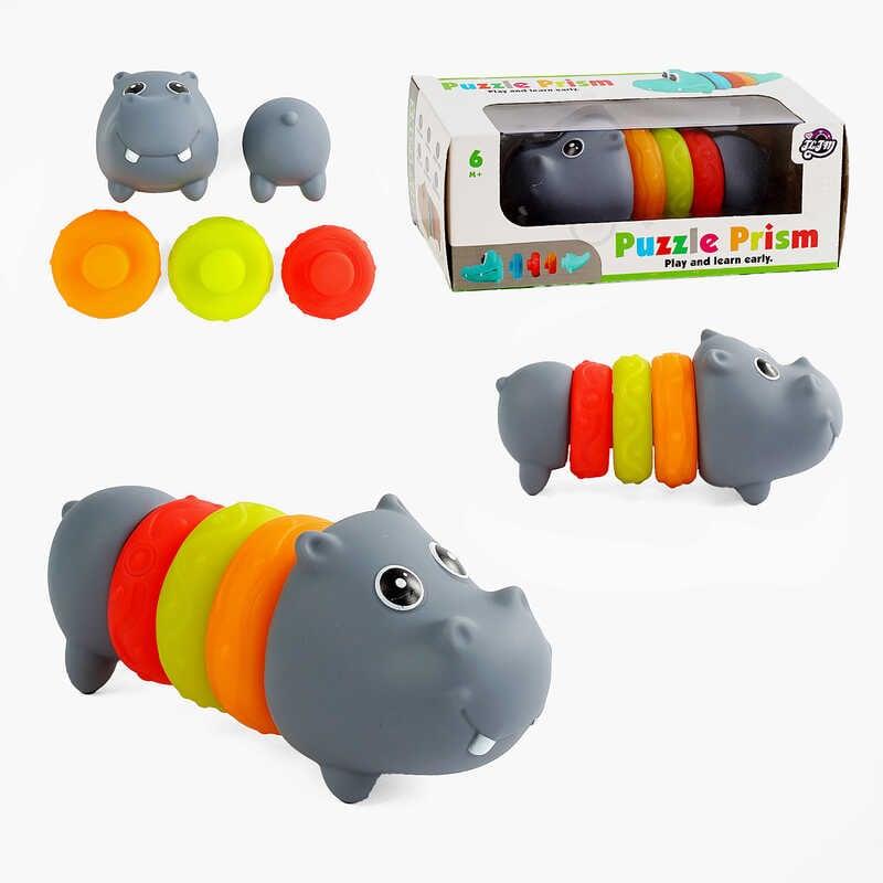 Незвична гумова пірамідка, яка виконана у вигляді бегемота! На відміну від класичного варіанту, ця пірамідка складається горизонтально та включає 5 елементів. Кожен з ігрових елементів пірамідки має поверхню з особливою текстурою, що сприяє розвитку сенсорного сприйняття дитини. Пірамідка стане чудовим інструментом для розвитку дрібної моторики рук, логічного й просторового мислення.