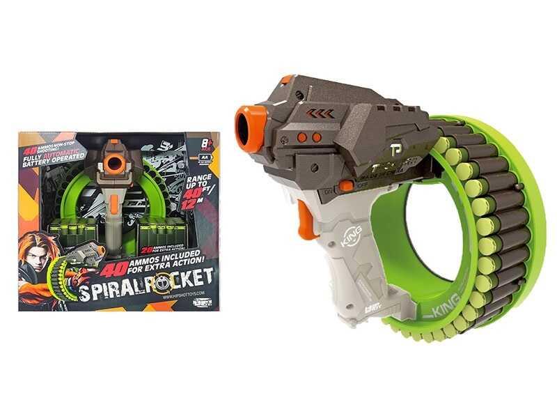 Справжня зброя майбутнього! Виконана у вигляді пістолета з футуристичним дизайном та яскравим забарвленням. Великий барабан вміщує одразу 40 патронів, тож гра обіцяє бути цікавою. Зброя працює за автоматичним принципом, тому достатньо натиснути на курок і барабан почне повільно рухатись по колу, виштовхуючи патрон крізь широке дуло.