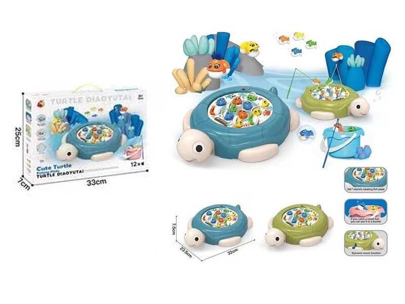 Цікава дитяча риболовля, яка виконана у вигляді черепашки. Замість панцира – ігрова платформа з осередками, яка рухається по колу під звуки дитячої мелодії. Принцип гри достатньо простий: помістіть в осередки кольорові рибки, активуйте гру за допомогою кнопки та почніть риболовлю. Завданням дитини буде підхопити кожну рибку за допомогою маленької вудки та скласти улов у відерце. Кількість ігрових елементів дозволяє грати одразу кільком гравцям.