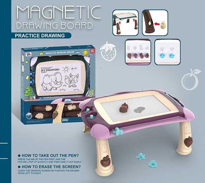 Іграшковий столик для найменших, який допоможе розкрити та розвинути творчі здібності малюка! Зручна дошка для малювання виконана у приємній колірній гамі. Столик має знімні ніжки, тож його можна легко перетворити у зручну панель та малювати у будь-якому положенні. До комплекту входять 6 фігурних штампів та магнітний стилус.