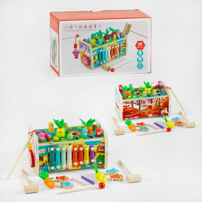Привітне кошеня запрошує до розваг та цікавого навчального процесу. Ігрова платформа поєднує веселу гру-стукалку, магнітну риболовлю, пальчиковий лабіринт, гру з шестернями, барвистий ксилофон та годинник з рухомими стрілками, за допомогою якого дитина легко навчиться визначати час. Кожна грань іграшки – самостійна і неймовірно цікава гра, яка надовго зосередить на собі увагу допитливої малечі і зробить день насиченим позитивними емоціями. Особливості: – годинник з рухомими стрілками; – пальчиковий лабіринт; – магнітна риболовля; – весела стукалка з молоточками; – обертові шестерні; – барвистий ксилофон; – гра розвиває логічне та просторове мислення, тренує дрібну моторику та координацію рухів, сприйняття кольорів та форм, вчить розрізняти звуки; – ігрові елементи виготовлені з дерева та пофарбовані якісними нетоксичними фарбами.