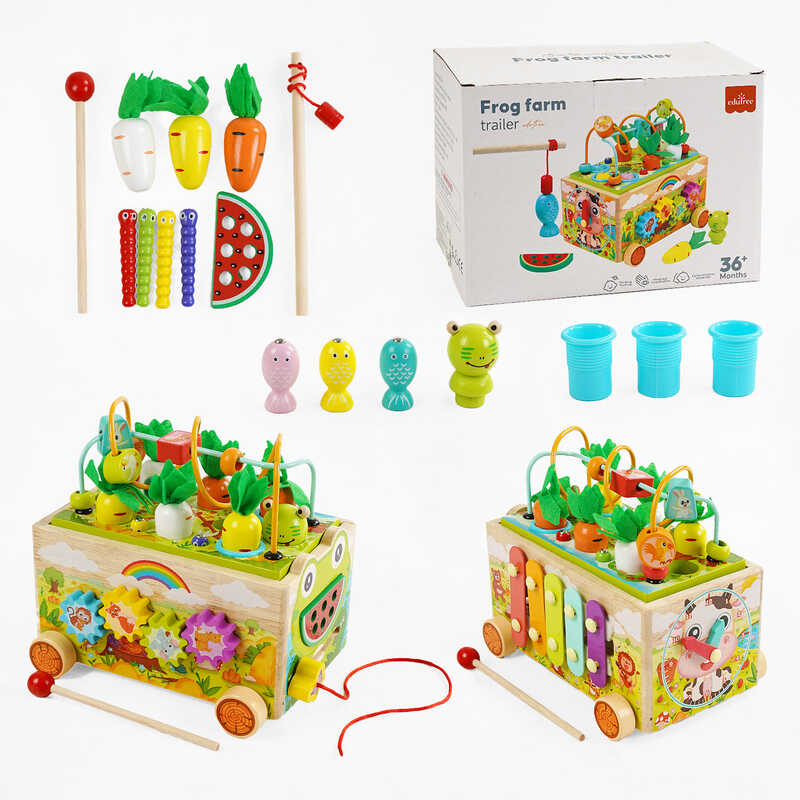 Багатофункціональна каталка стане чудовим вибором розвивальної іграшки для вашої малечі. Важливо, аби дитина всебічно розвивалася та навчання було їй у радість. І на ранньому етапі життя у цьому на допомогу приходять дерев’яні іграшки. Деревина є екофрендлі матеріалом, який є нетоксичним та безпечним для дітей. Іграшка виконана з відшліфованої та покритої лаком деревини, на якій відсутні гострі кути. Гра з такими іграшками розвиває дрібну моторику ручок та координацію рухів дитини, допомагає розвинути логічне мислення та пам’ять.Особливості:- розміри: 24х16.х19 см;- каталку та її елементи виконано з дерева;- каталка має ксилофон та паличку для гри на ньому;- іграшковий годинник та шестерні;- кришка каталки є двосторонньою із пальчиковим лабіринтом з одного боку;- кришка каталки має невеличку грядку з морквою та магнітну риболовлю;- до набору включено вудку для магнітної риболовлі.